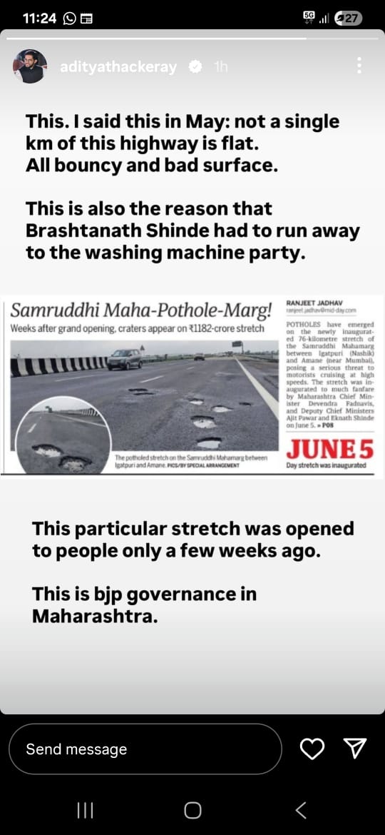 आदित्य ठाकरे यांनी या खड्ड्यांबाबतची एक बातमी इन्स्टाग्राम स्टोरीवर शेअर करून म्हटले आहे की, मे महिन्यात हीच बाब मी सांगितली होती. समृद्धी हायवेवर फक्त खड्डेच खड्डे आहेत, कुठेही हा मार्ग सरळ नाही. याचमुळे भ्रष्टनाथ शिंदे यांनी पळ काढळा आणि वॉशिंग मशीन पार्टीत गेले. तसेच काही आठवड्यांपूर्वीच या मार्गाचे उद्घाटन झाले होते. हे आहे महाराष्ट्रातलं भाजप सरकार असेही आदित्य ठाकरे म्हणाले.