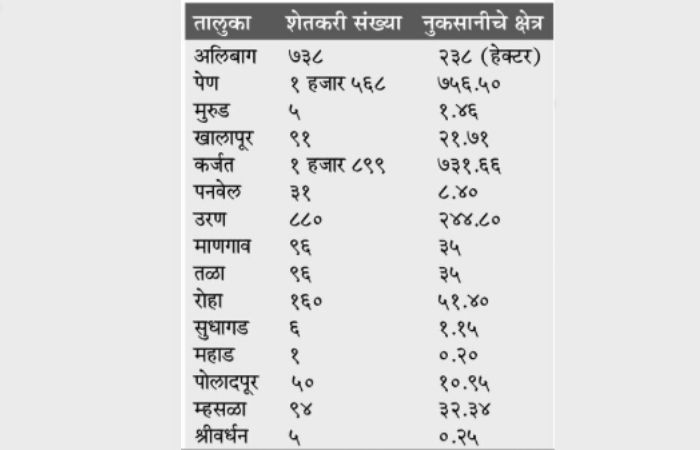 - रायगड जिल्ह्यातील ५ हजार ८७८ शेतकऱ्यांच्या २ हजार १८५.१२ हेक्टर भात शेतीचे नुकसान झाले आहे. डोळ्यादेखत पिकाची झालेली माती पाहून बळीराजाच्या डोळ्यांतून अश्रू वाहात आहेत.