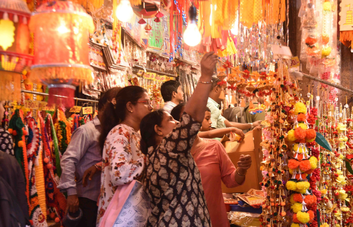 दिवाळी सण जेमतेम आठवडाभरावर आला असून या सणाच्या स्वागतासाठी शहरातील बाजारपेठा सजल्या आहेत. रांगोळ्या, लायटिंगचे तोरण, पारंपरिक आकाशकंदील, खमंग फराळ, कपडे, इलेक्ट्रॉनिक वस्तू, घराच्या सजावटीसाठी लागणाऱ्या शोभेच्या वस्तू अशा विविध वस्तूंच्या खरेदीसाठी दादर, लालबाग, बोरिवली, घाटकोपरसह शहरातील विविध बाजारपेठांमध्ये खरेदीसाठी मुंबईकरांची झुंबड उडाली आहे.